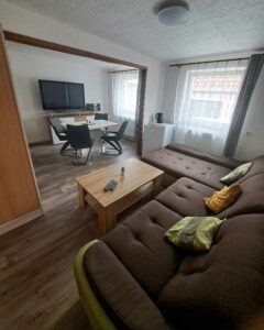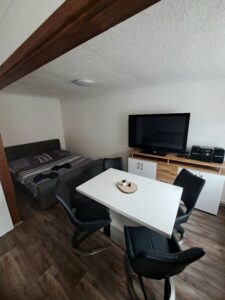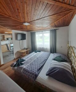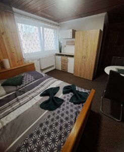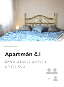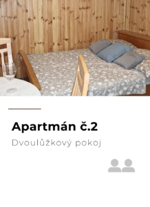 Dále nabízíme k přespání dvou až třílůžkové samostatné pokoje. Pokoje v podkroví jsou vybaveny manželskou postelí nebo oddělenou postelí, satelitní TV s plochou obrazovkou. K dispozici je společná plně vybavená kuchyňská linka, včetně trouby. K těmto pokojům patří společné sociální zařízení (sprcha, WC), které je umístěné na chodbě.