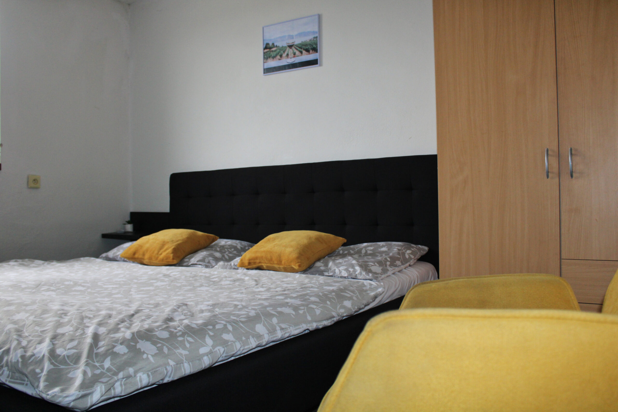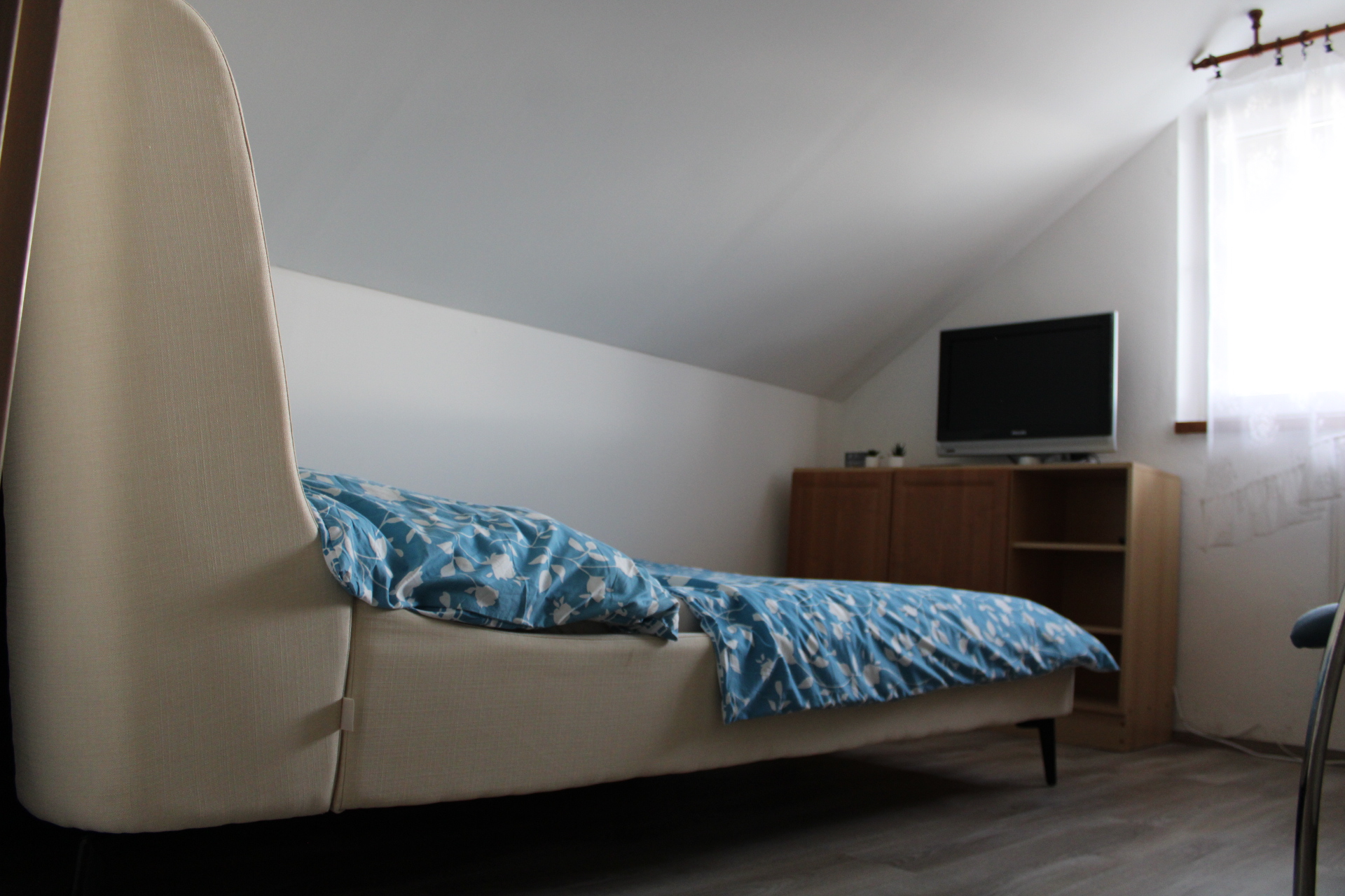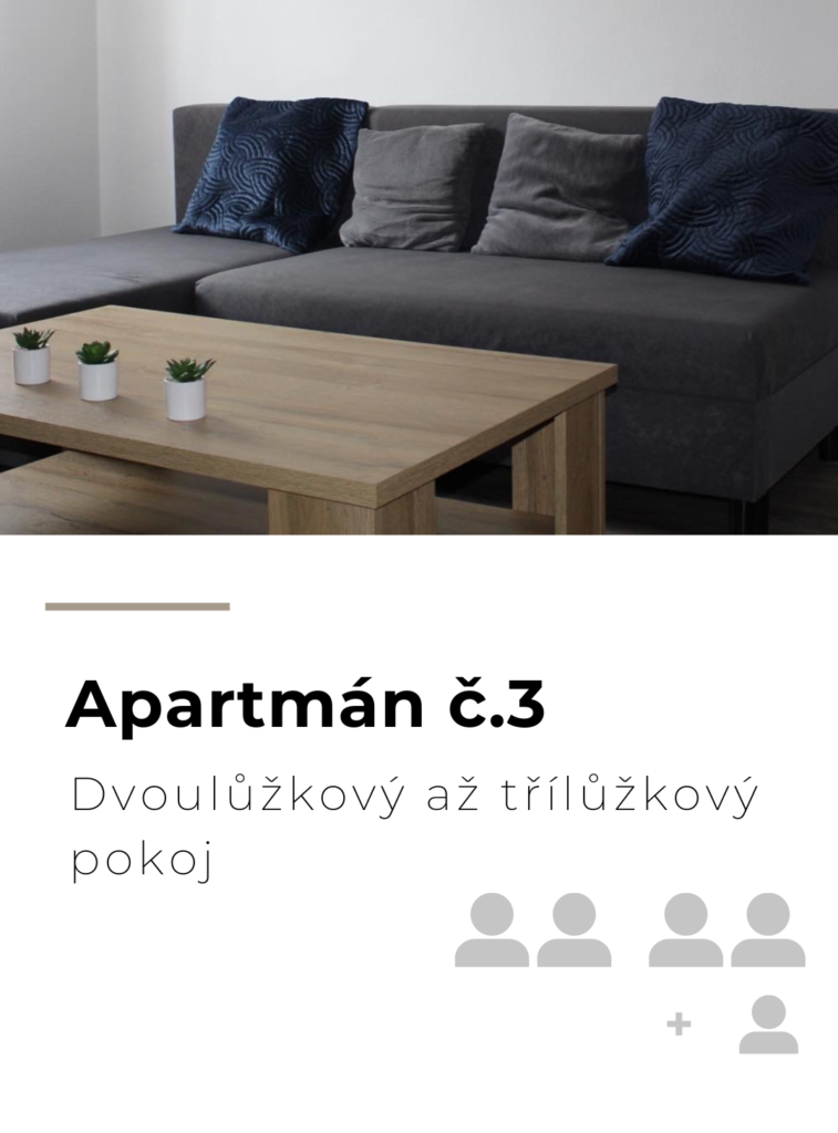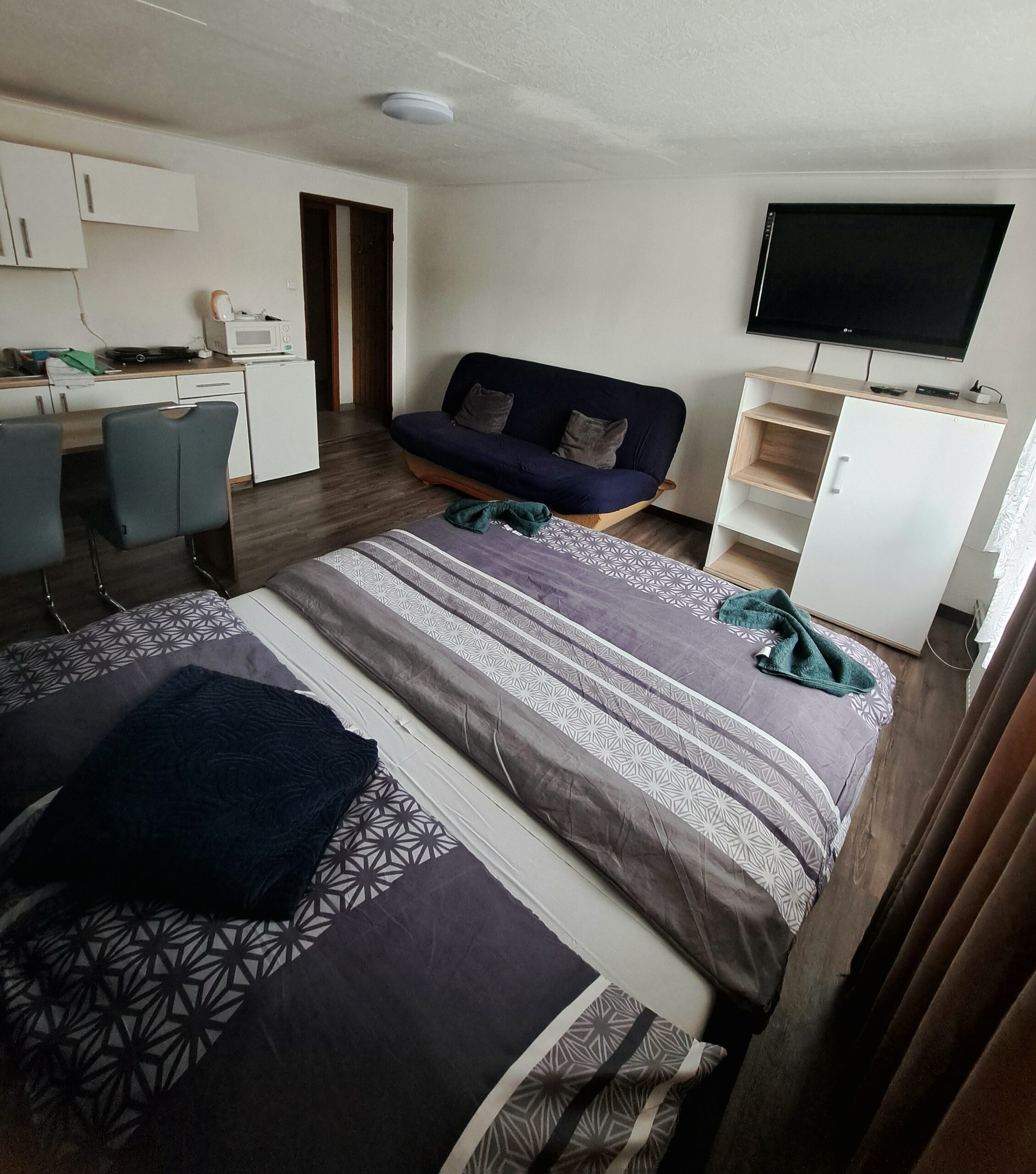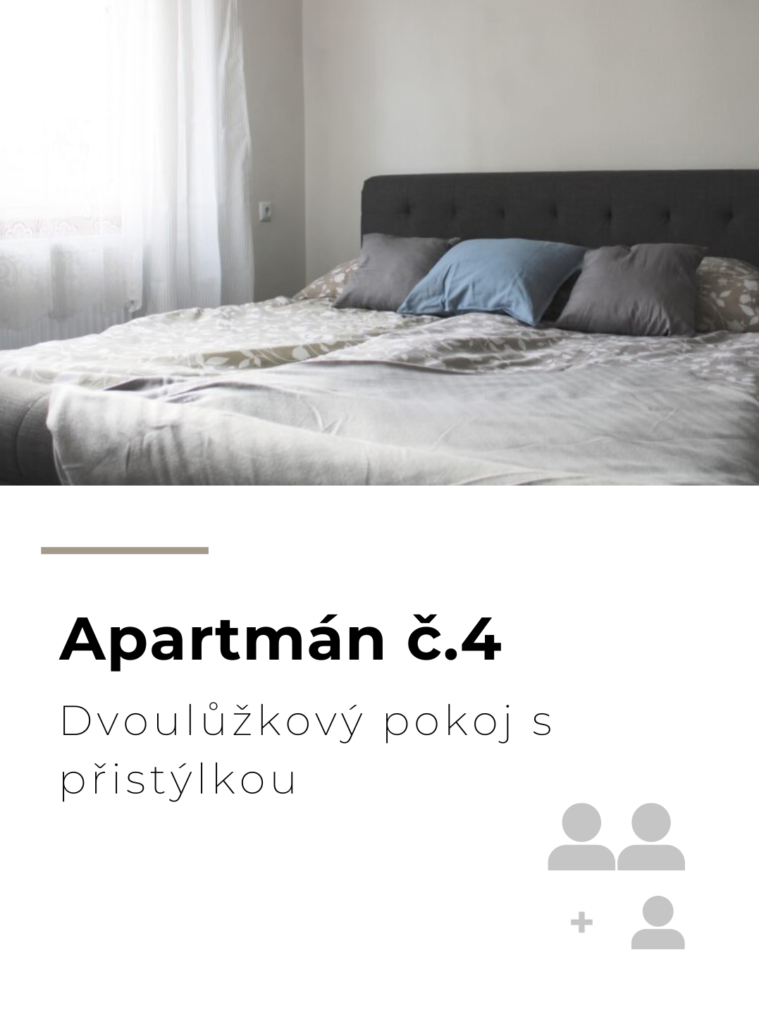 Dále nabízíme k přespání dvou až třílůžkové samostatné pokoje. Pokoje v podkroví jsou vybaveny manželskou postelí nebo oddělenou postelí, satelitní TV s plochou obrazovkou. K dispozici je společná plně vybavená kuchyňská linka, včetně trouby. K těmto pokojům patří společné sociální zařízení (sprcha, WC), které je umístěné na chodbě.